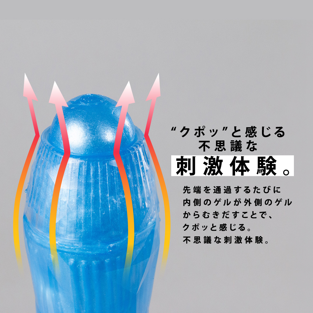 ”クポッ”と感じる不思議な刺激体験。先端を通過するたびに内側のゲルが外側のゲルからむきだすことで、クポッと感じる。不思議な刺激体験