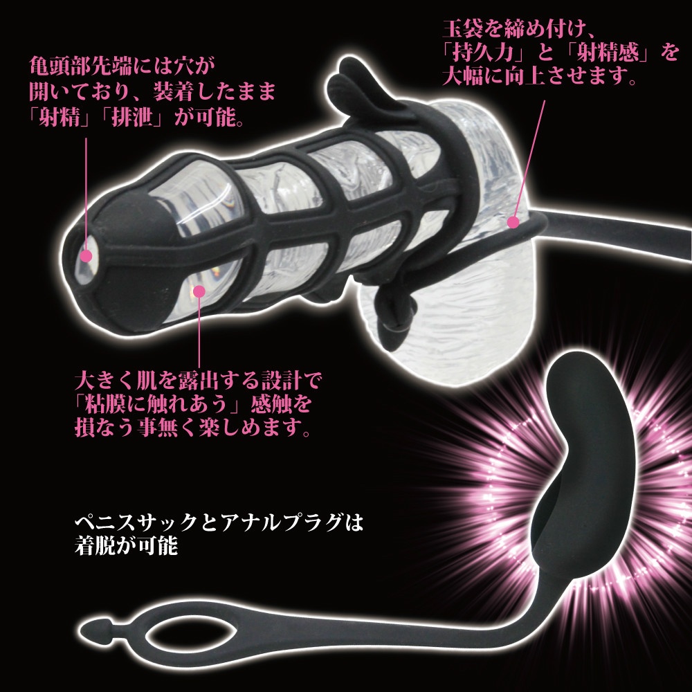 メッシュ状のサックによる持久力サポートと、アナルプラグによる前立腺刺激で射精感を大幅UP!