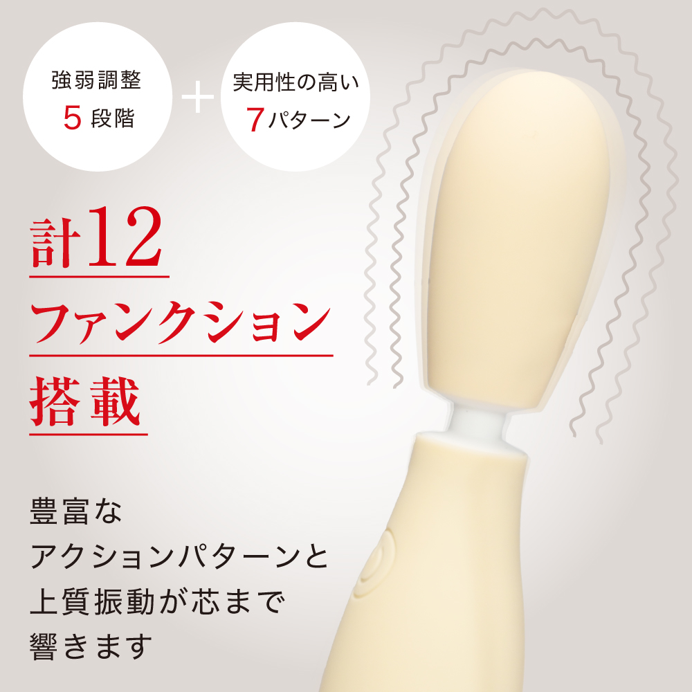 精密に組み合わせたパーツと上質なモーターにより、振動音がわずか30-55dBの静音設計なのに芯まで響くバイブは細かい調節が可能な5段階強弱調整と実用性の高い7パターン振動の計12ファンクション搭載。