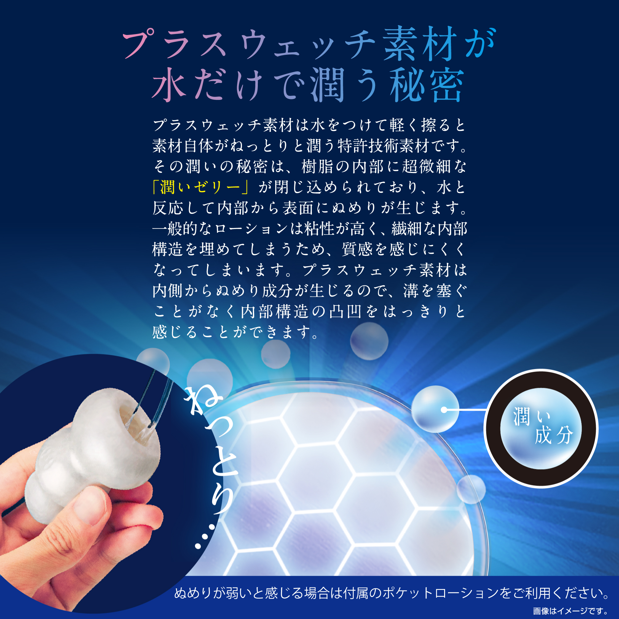 濃密で多彩な快楽を味わえる、主役級の内部構造4種を詰め込んだボックス。水に反応して潤いゼリーがしみ出す、特許登録済み素材「プラスウェッチ」。内部構造は、ウェーブ・ドット・シャワー・コンボの4種