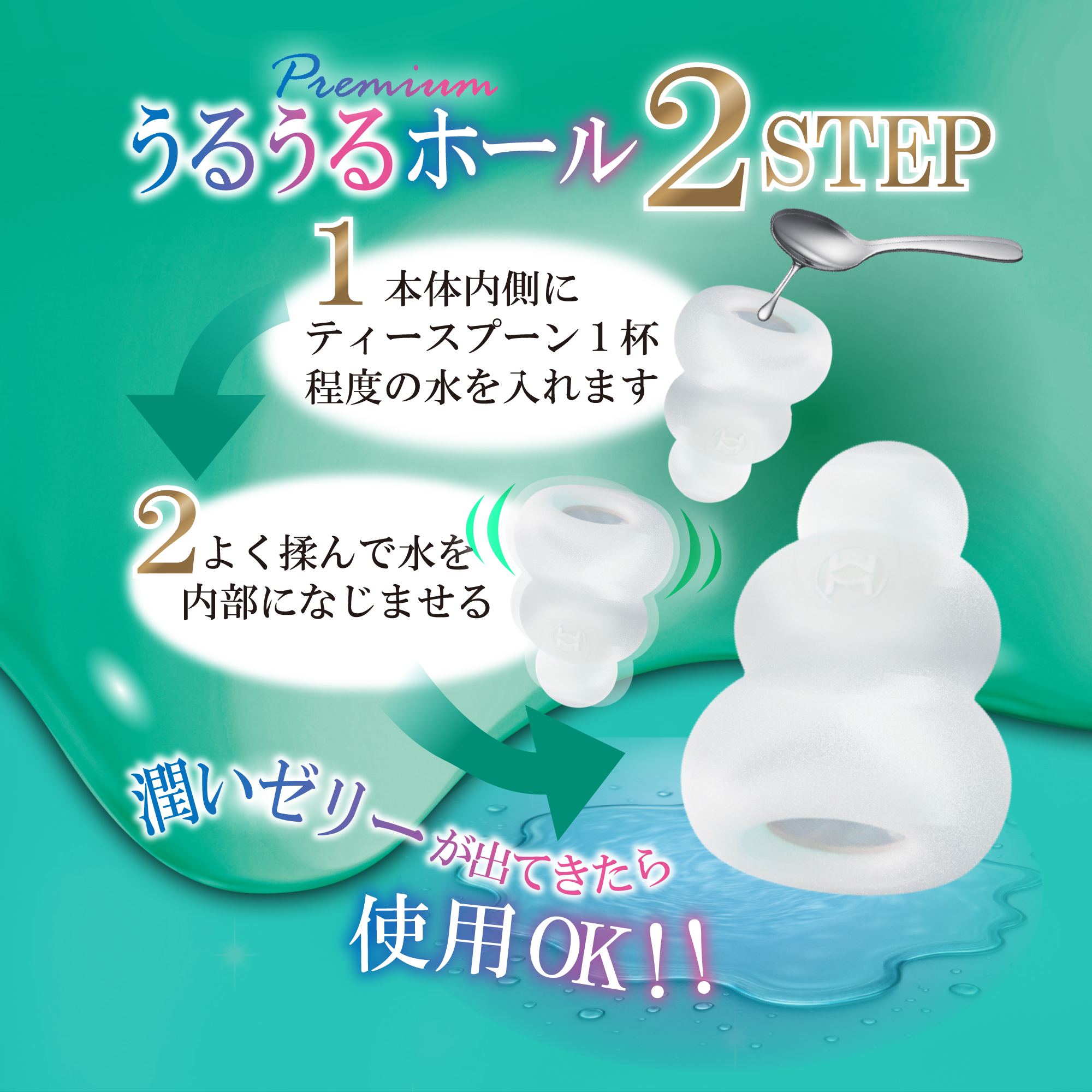 ①本体内側にティースプーン1杯程度の水を入れます②よく揉んで水を内部になじませる(潤いゼリーが出てきたら使用OK!)