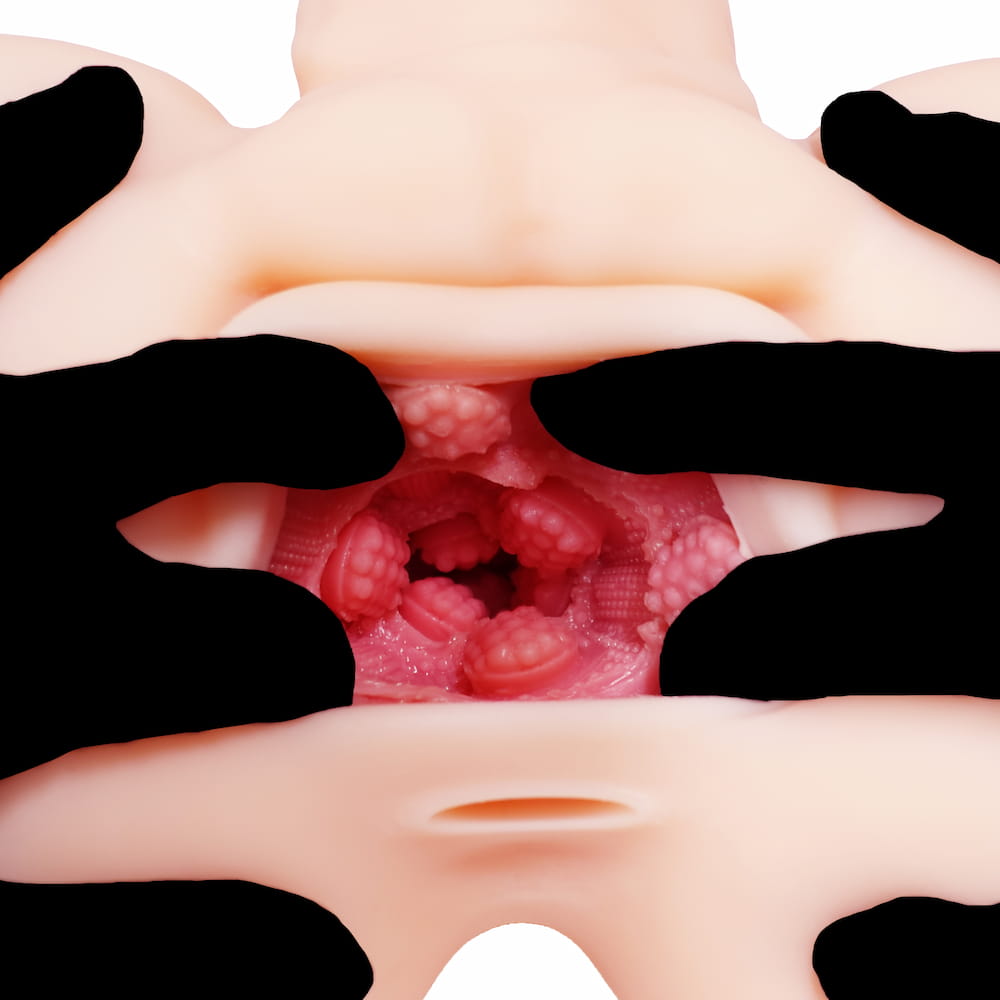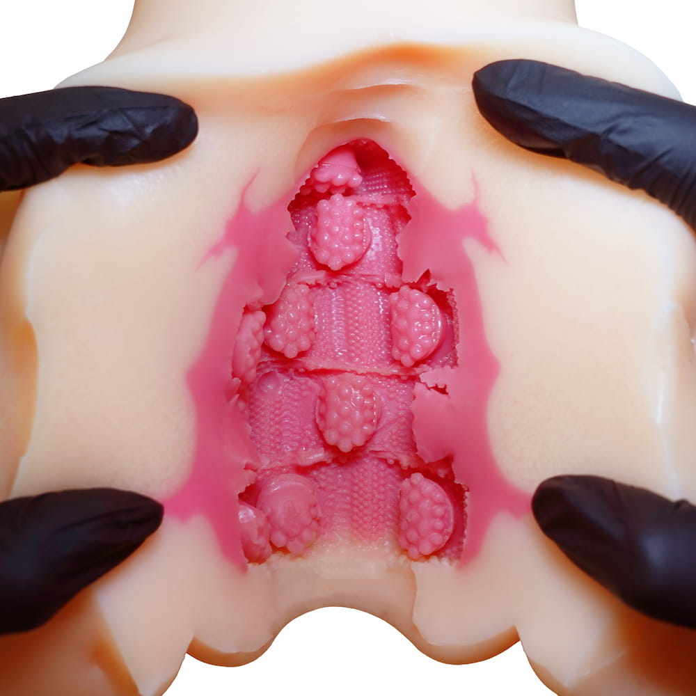 お腹をぐっと押す要領で内部の空気をしっかり抜くと、バキュームによる内部の吸着効果が発生します。内壁が密着するので締めつけや掻き分けてこすれる感触が奥に進むほどに高まり、ぐっと刺激が強まります。