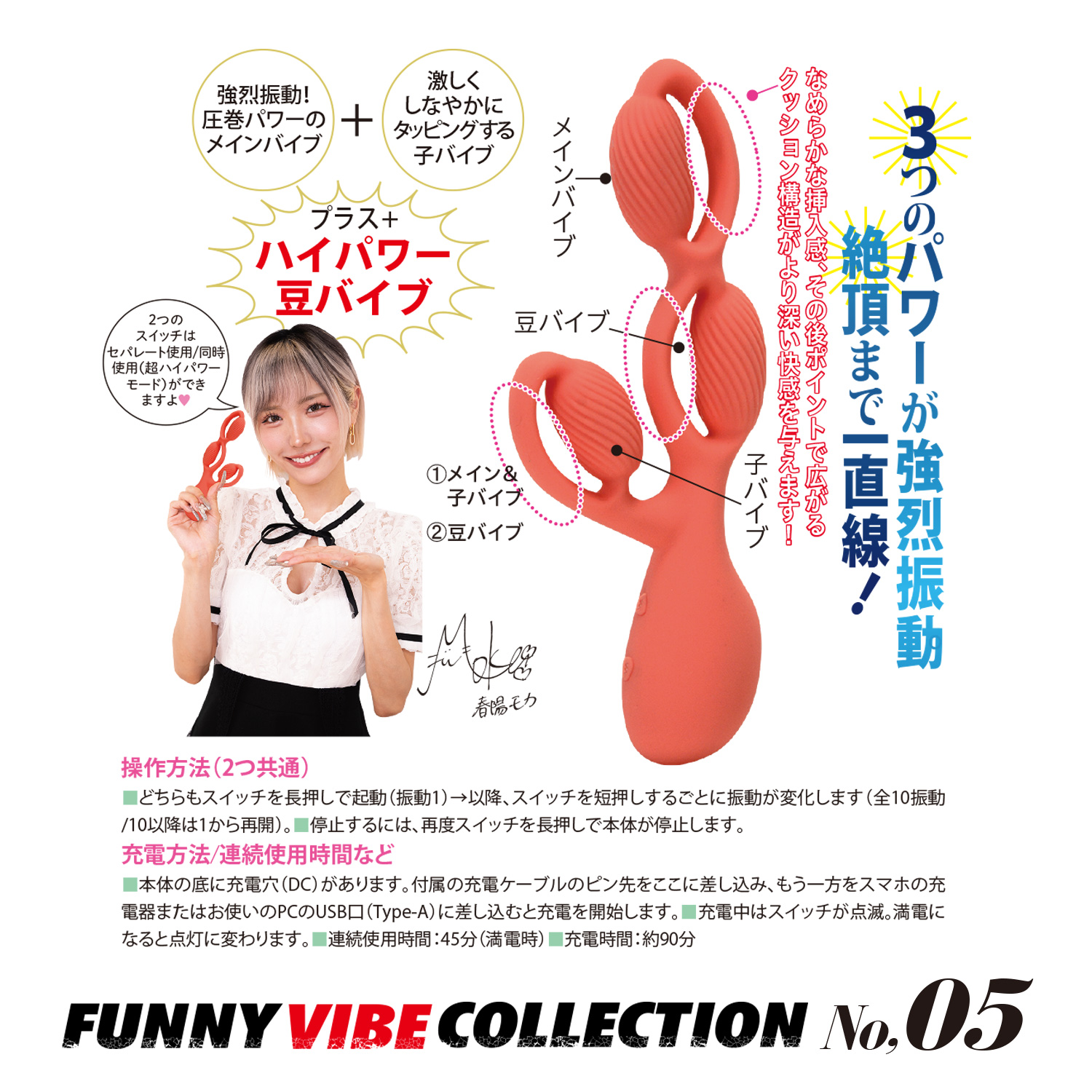メイン+子バイブ/豆バイブと、3つのハイパワーを秘めた最強の激快感バイブ!セパレート/両方同時の使い分けができ、特に豆バイブはイカせどきの使用が効果的です。また各バイブにクッション部を加え、形状による快感と振動の刺激をより活かす設計となっています