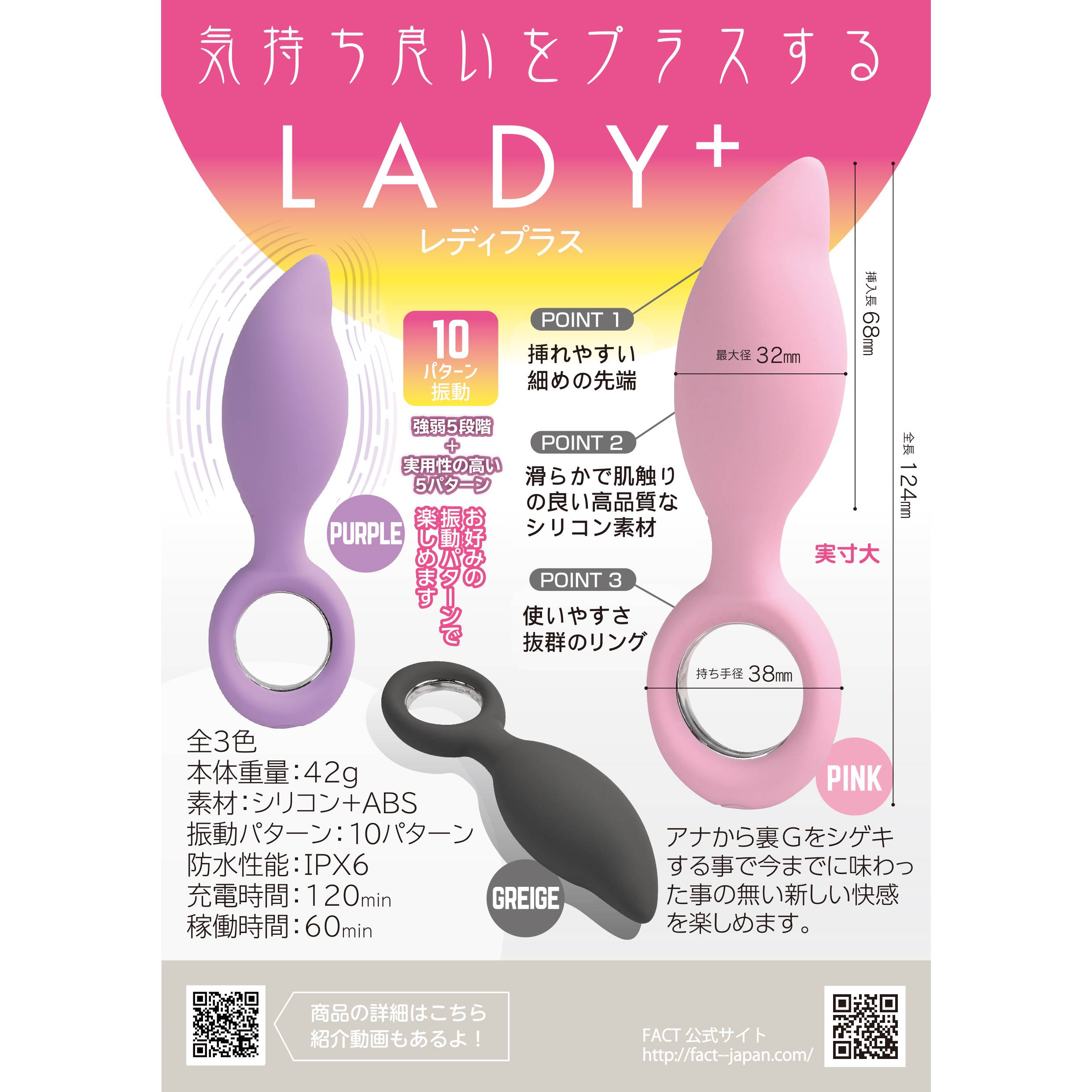 挿れ易さと満たされ感を追求した形状と、絶妙なサイズ感に持ちやすく使い易いリングの持ち手+滑らかで触り心地バツグンの、高品質医療グレードシリコン素材+高性能モーター搭載の、新しい快感を気軽に楽しめるアイテムです。