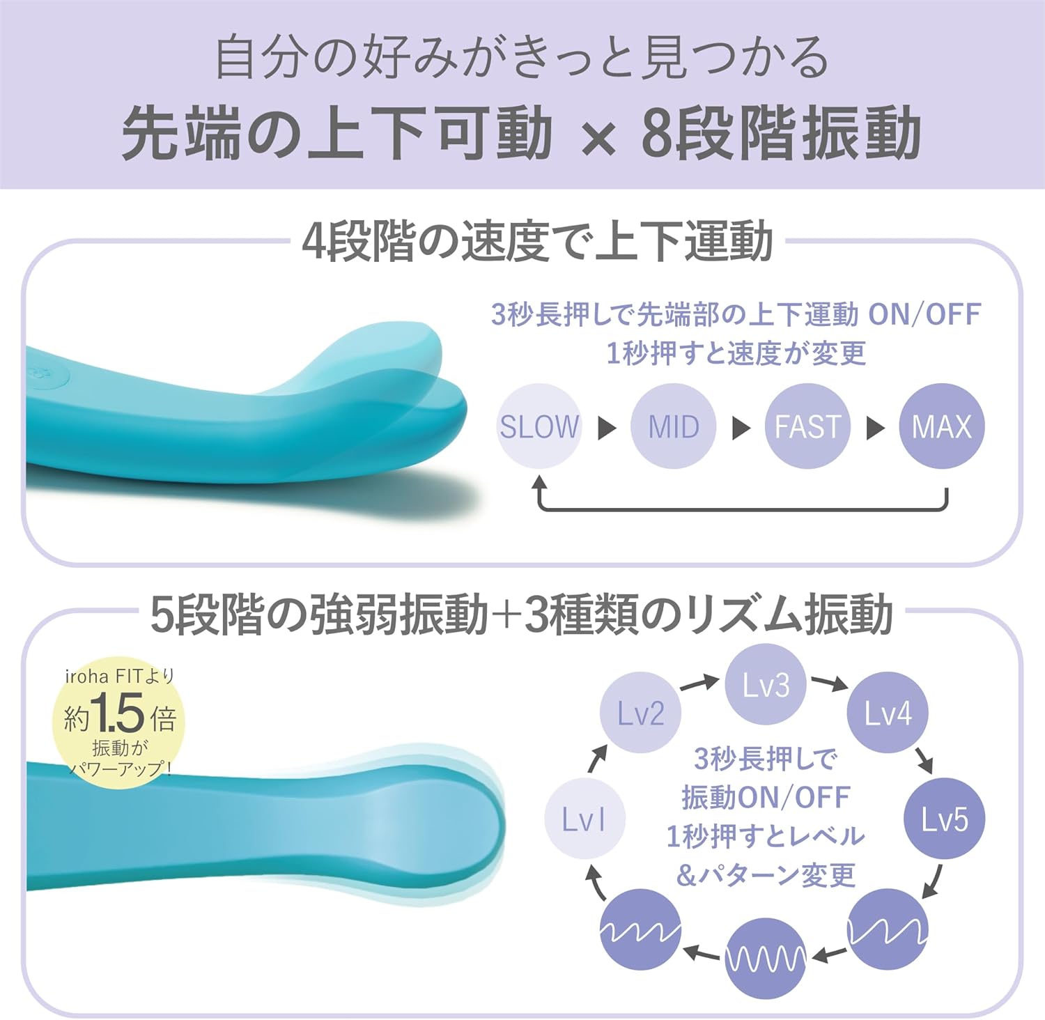 わたしの快感、アップデート。iroha初の先端可動アイテム「iroha FITプラス」。ふわふわでサラサラな質感の先端部分が上下運動し、多様なリズムで振動します。振動と上下可動の組み合わせによって、押し寄せる波のような快感をお楽しみください