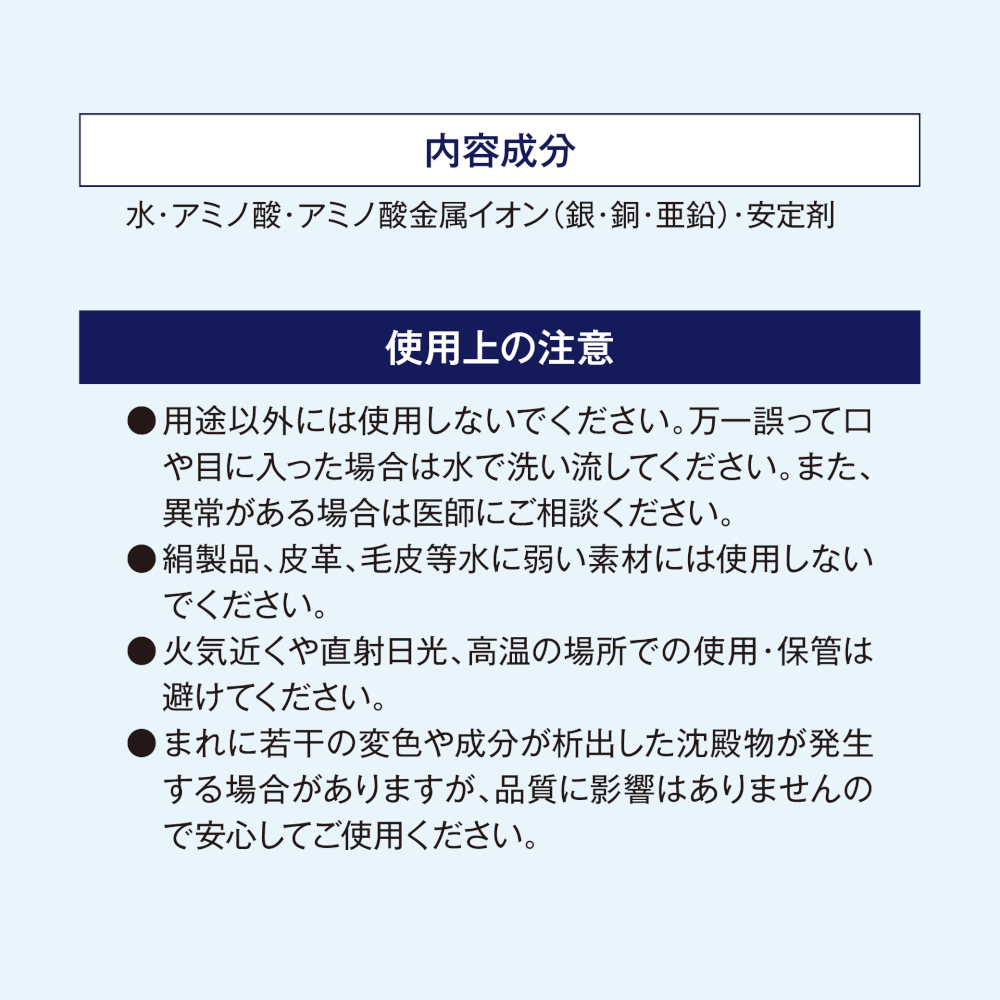 【成分】水・アミノ酸・アミノ酸金属イオン(銀・銅・亜鉛)・安定剤