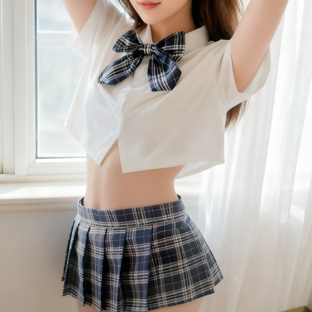 白のショートトップスはクラシックな制服の雰囲気を保ちつつ、おへそとウエストを自然に見せてさりげなく誘惑アピール。