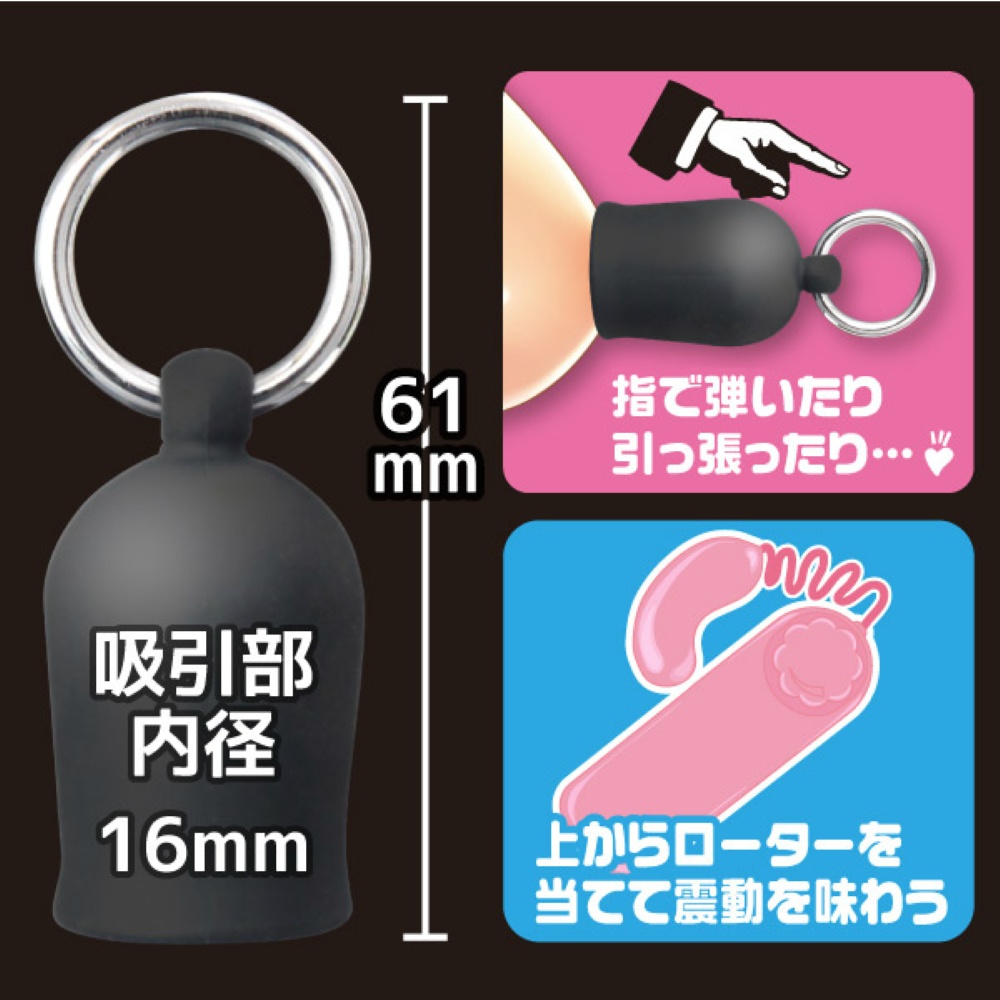 吸い付けた後は、リングを持って思い切り引っ張ったり、サックの上からローター等で振動を与えて虐めてみたり使い方は色々♪