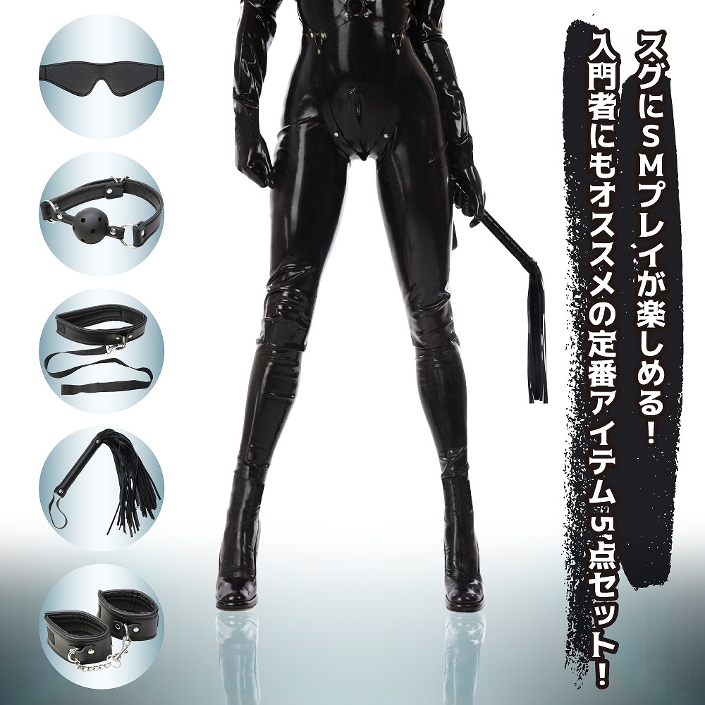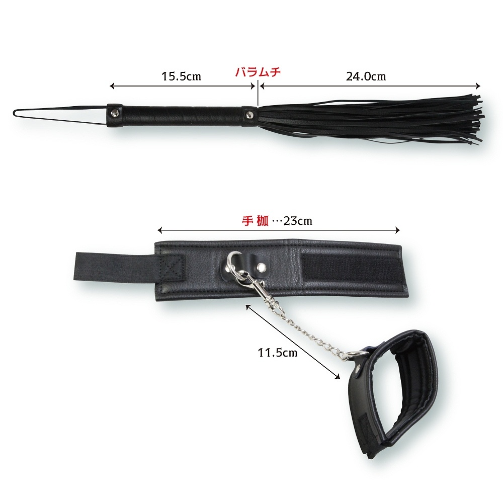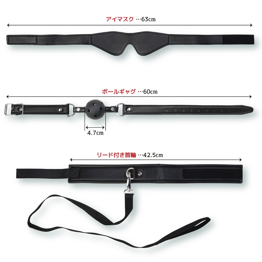 【セット内容】アイマスク、ボールギャグ、リード付き首輪、手枷、バラムチ