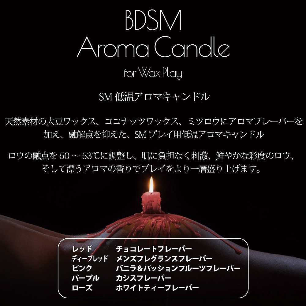 天然素材の大豆ワックス、ココナッツワックス、ミツロウにアロマフレーバーを加え、融解点を抑えた、SMプレイ用低温アロマキャンドル。ロウの融点を50から53℃に調整し、肌に負担なく刺激、鮮やかな彩度のロウ、そして漂うアロマの香りでプレイをより一層盛り上げます