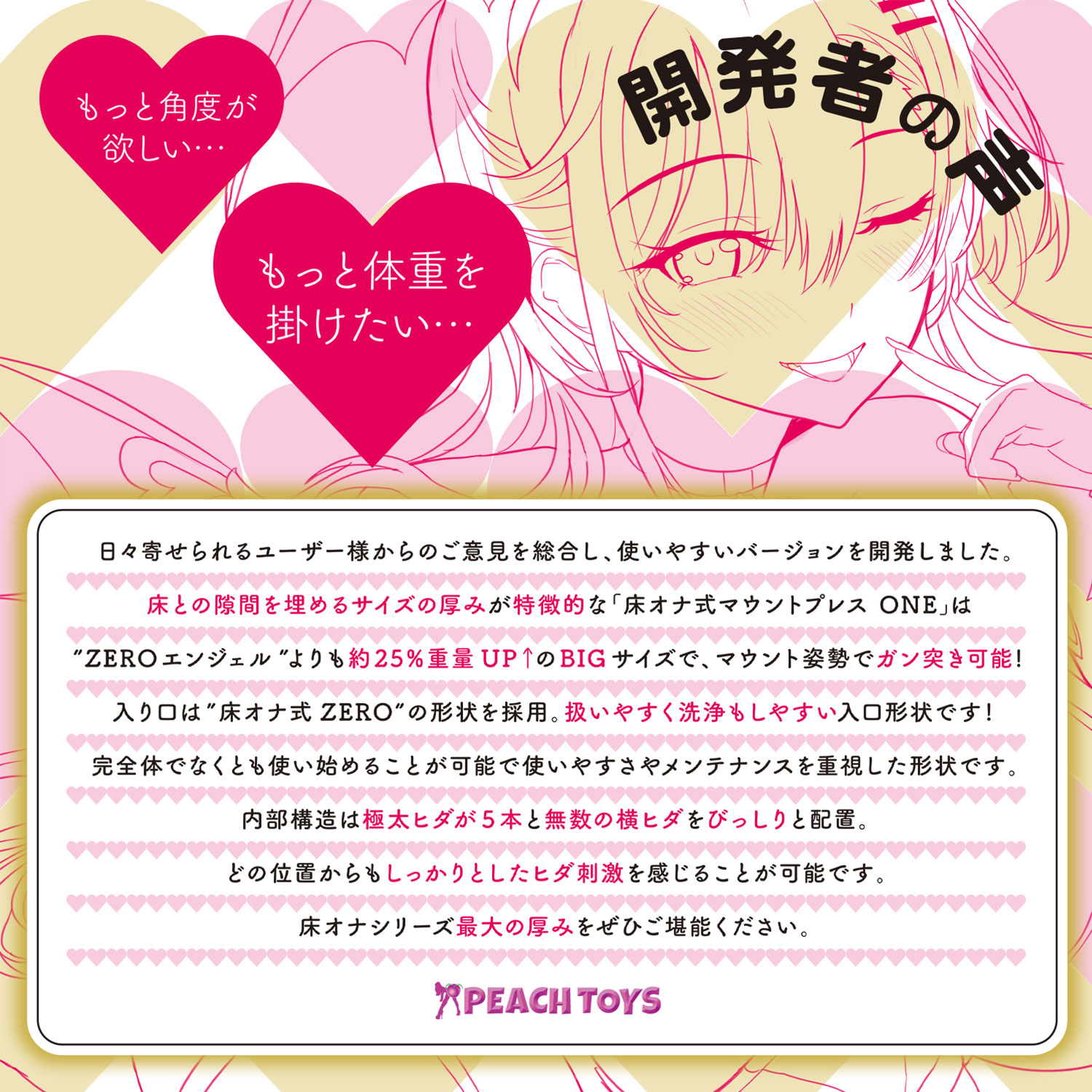 「もっと角度が欲しい・・・.もっと体重を掛けたい・・・」「床オナ式」シリーズに最大の厚み!!”ZEROエンジェル”よりも約25%重量UP↑のBIGサイズで、マウント姿勢でガン突き可能!存在感のあるMIMIZUヒダが蠢く内部構造!!