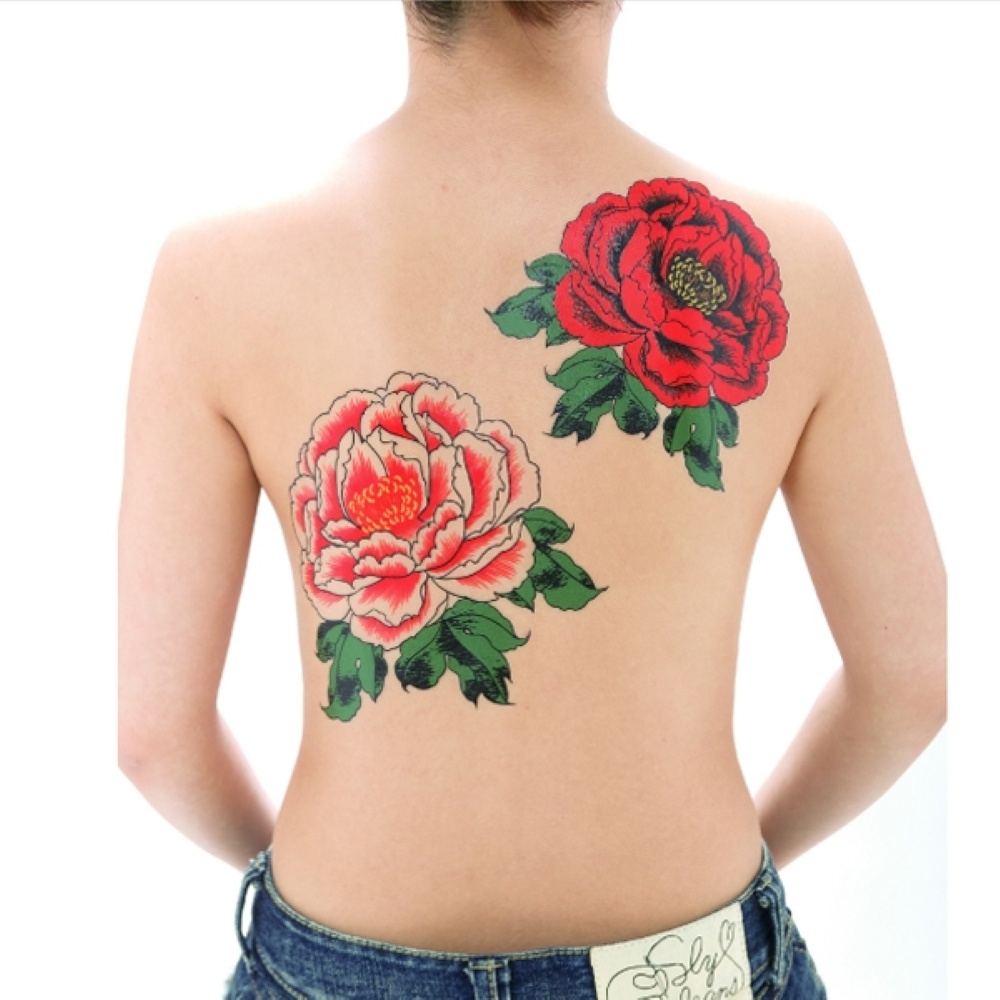 柄:赤牡丹。祭り化粧はお肌に直接つける、ちょっと色っぽい新しいファッションアイテム。特殊な素材を使用しておりますので、皮膚の動きと一緒に伸び縮みします。入浴したり、海やプールに入っても3日は取れません