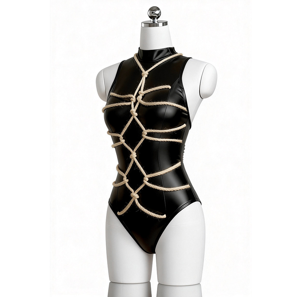 レーザーによる亀甲模様が目を奪う。レーザホワイト×赤い紐――清純を縛る、禁断の構図。誘うように伸び上がるストレッチ素材。全身を包みつつ裸より妖艶な「和×エロス」。