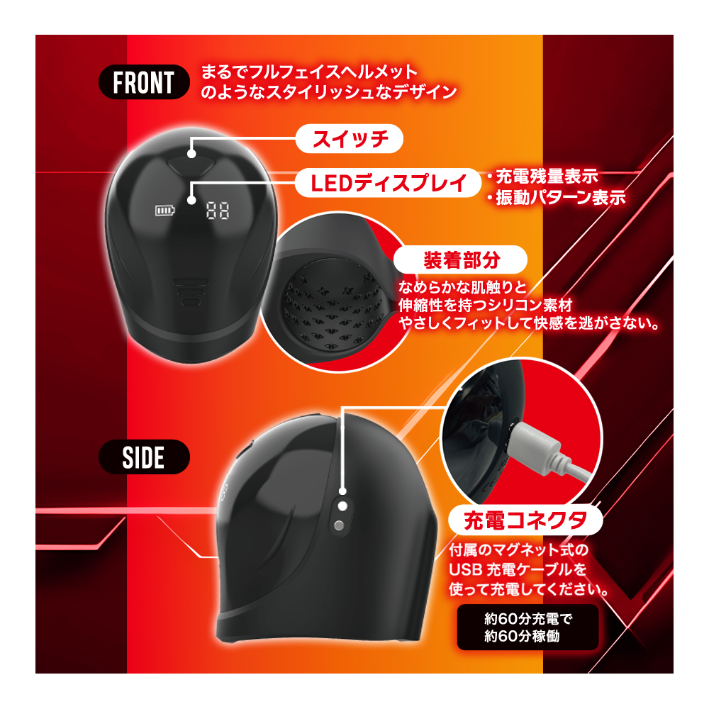 ヘッドに走る衝撃。爆速振動のメンズ快感。まるでフルフェイスヘルメットのようなスタイリッシュにイカしたデザインの、亀頭責め用のメンズローターです。すぽっとヘッドに装着すれば、ブルブルとした爆速振動と衝撃快感がアナタに迫る!