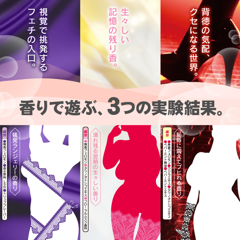 誘惑の質感を思わせる「挑発ランジェリーの香り」、大人の夜を越えた翌朝の、肌に残るような余韻をイメージした「濡れ残る翌朝の生々しい香り」、そしてクセになる深みを感じる「恥辱に震えてブヒれる香り」。