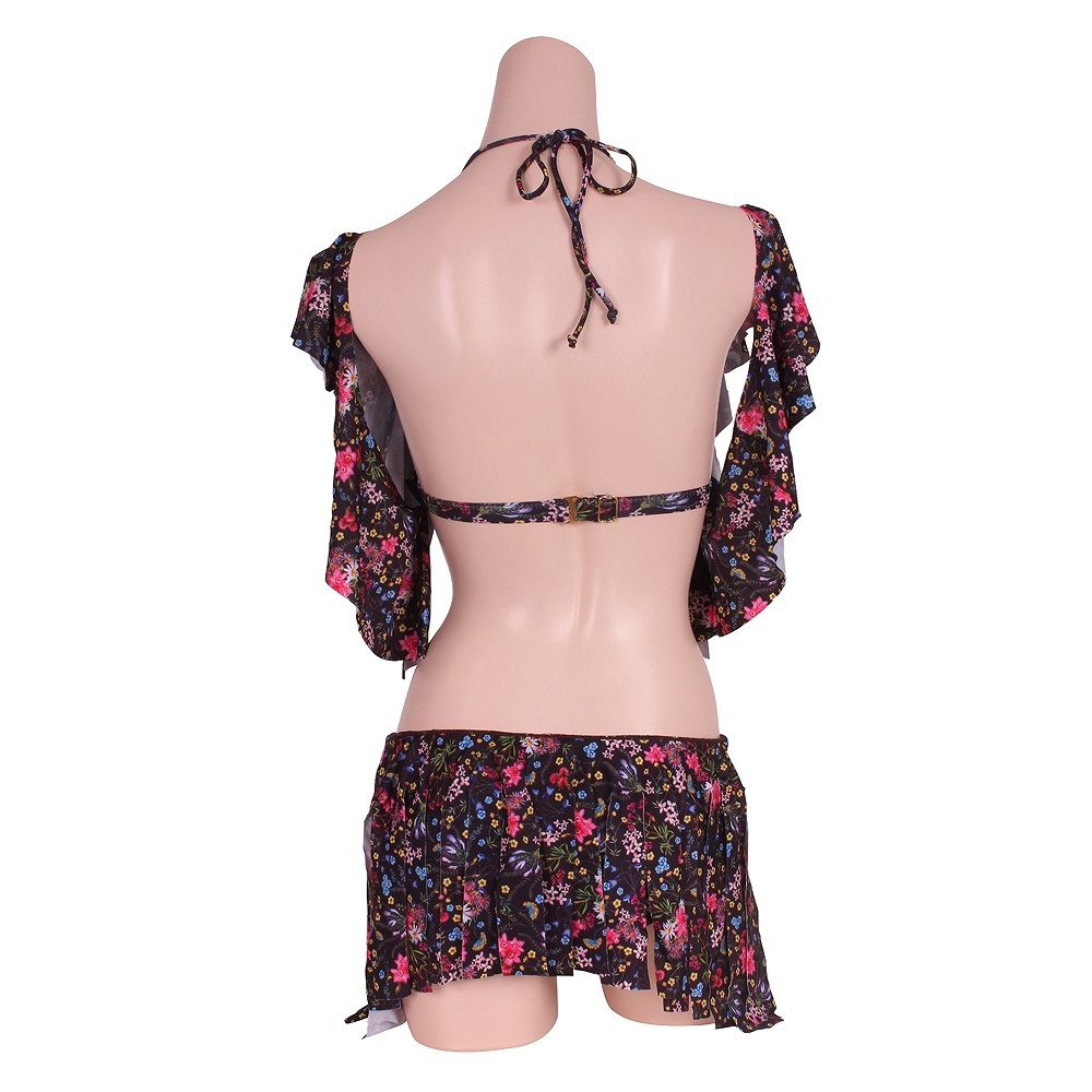 デコルテを輝かせるオフショルダーデザインのブラと切りっぱなしの共布フリンジをボトムに重ねて、どこまでも女性の「きれい魅せ」を意識しています!黒生地に可憐な小花プリントで麗しさを満喫